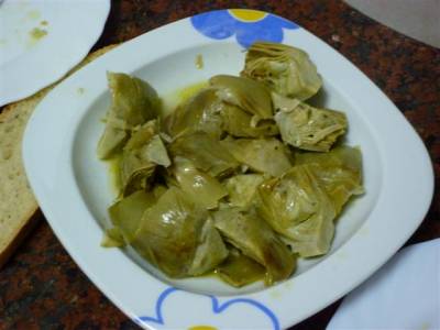 Pelar las alcachofas bien, y cortarlas en cuartos. Bien limpias se mojan en un limón y se dejan en un plato hondo con agua y limon para que se queden blanquitas. Una vez tenemos las alcachofas limpias se prepara una olla y se echa un chorro de aceite que cubra bien el fondo, seguidamente se cortan los dientes de ajo a laminas y se vierten en la olla.Se echan los granos de pimienta tambien. En ese momento se enciende el fuego y se echan a continuación las alcachofas(sin que se frían los ajos) y la sal.