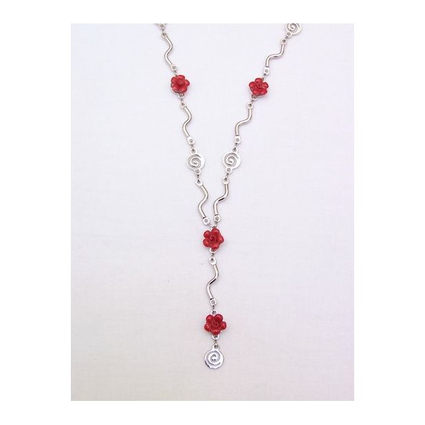 Collar de porcelana hecho a mano montado sobre rodio con flores de color rojo.