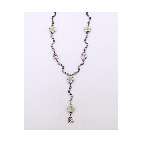 Collar hecho a mano de porcelana fina montado sobre acero negro. Flores de color verde nacarado